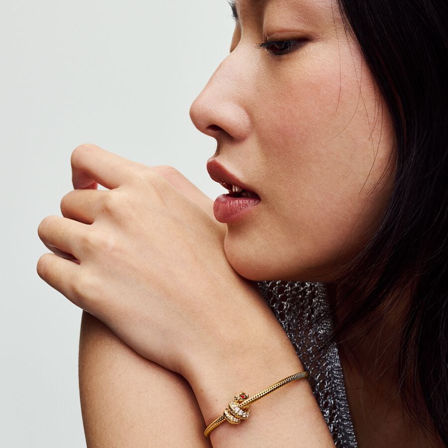 Invite good fortune in the coming year with the Two-tone Chinese Year of the Dragon Charm. 2024 is the Year of the Dragon – the 5th animal in the Chinese zodiac, this mythical creature represents good fortune, strength, power, wisdom and health. This 14k gold-plated charm features an intricately detailed dragon with a row of pavé along one side of its body and scale details on the other. Sparkling red pear-shaped stones bring the dragon’s eyes to life, and its body is curled to wrap around your bracelet or charm holder, creating a sense of movement. Wear this charm to invite the qualities of the dragon into your year ahead, or gift it to a loved one who was born in the Year of the Dragon.