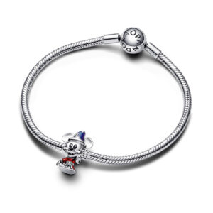 One of Disney’s most beloved characters returns with the Disney Sorcerer Apprentice Mickey Charm. This charm features hand-applied glittery enamel details and shining star motifs inspired by Disney’s much-loved Fantasia. Mickey Mouse is even holding a round cubic zirconia set in a star, a sparkling reminder of the magic that’s never far away. On its own or as a playful pop to your favorite everyday styling, this charm is a must-have for any Fantasia fan.