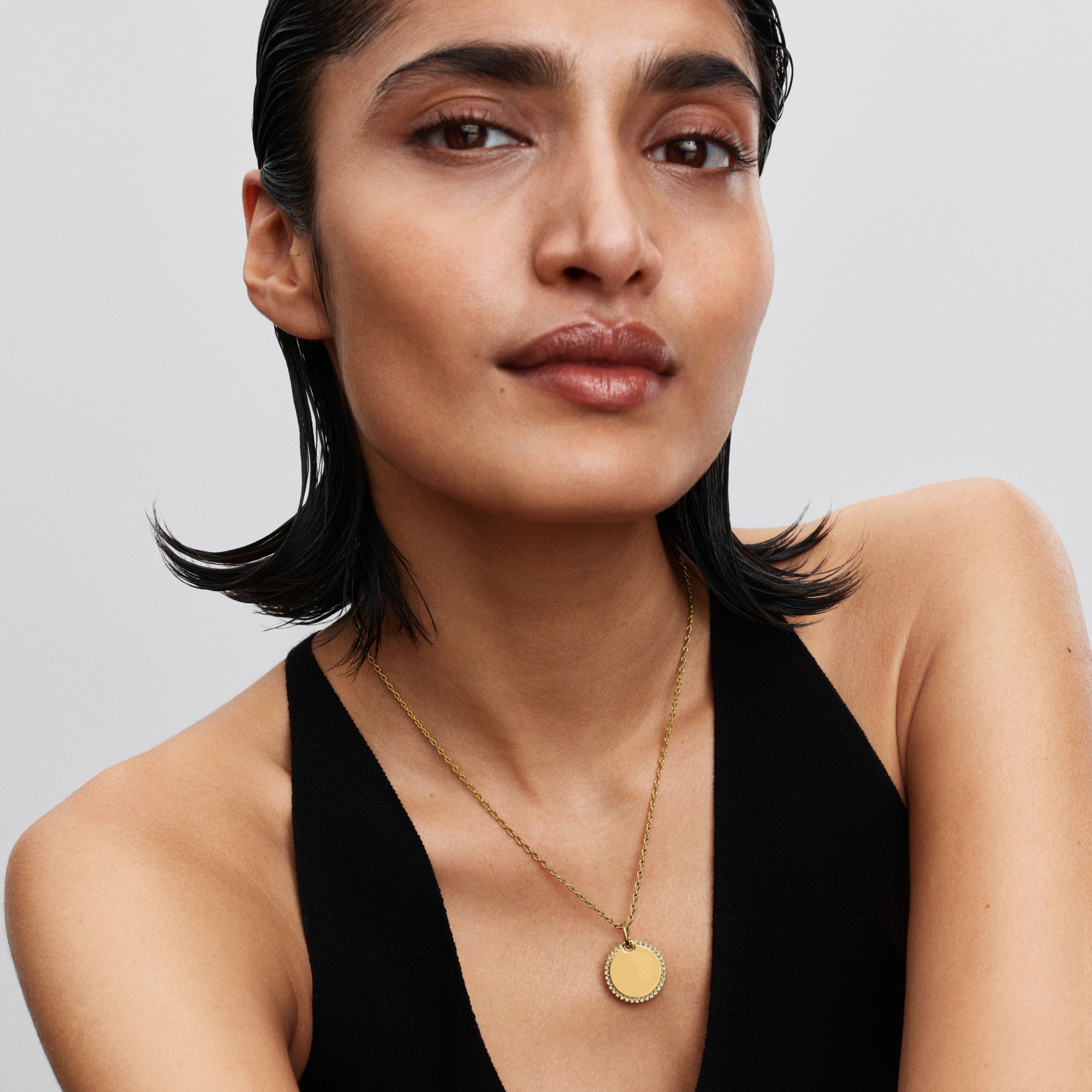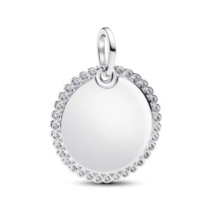Minimalist style that makes a statement. Add our 14k gold-plated or sterling silver engravable disc pendant, encircled in a halo of sparkling stones, to your collection.