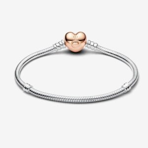 Set your heart a-flutter with this romantic version of Pandora’s bestselling charm bracelet. Hand-finished with a 14k rose gold-plated heart-shaped clasp, this sterling silver Moments Heart & Snake Chain Bracelet looks stunning on its own but even better adorned with your favourite Pandora Moments charms and clips. Layer it with contrasting Pandora chain bracelets for a chic, multi-layered look.