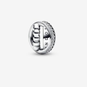 A sophisticated addition to your jewelry box. Crafted in sterling silver, the Pandora Moments Logo Pavé & Beads Charm features two circular bands enveloped within a diagonal band to create a unique geometrical shape. A row of pavé adds sparkle, while microbeading gives it texture and dimension. Wear this charm on your bracelet and tell your story, your way.