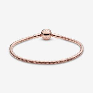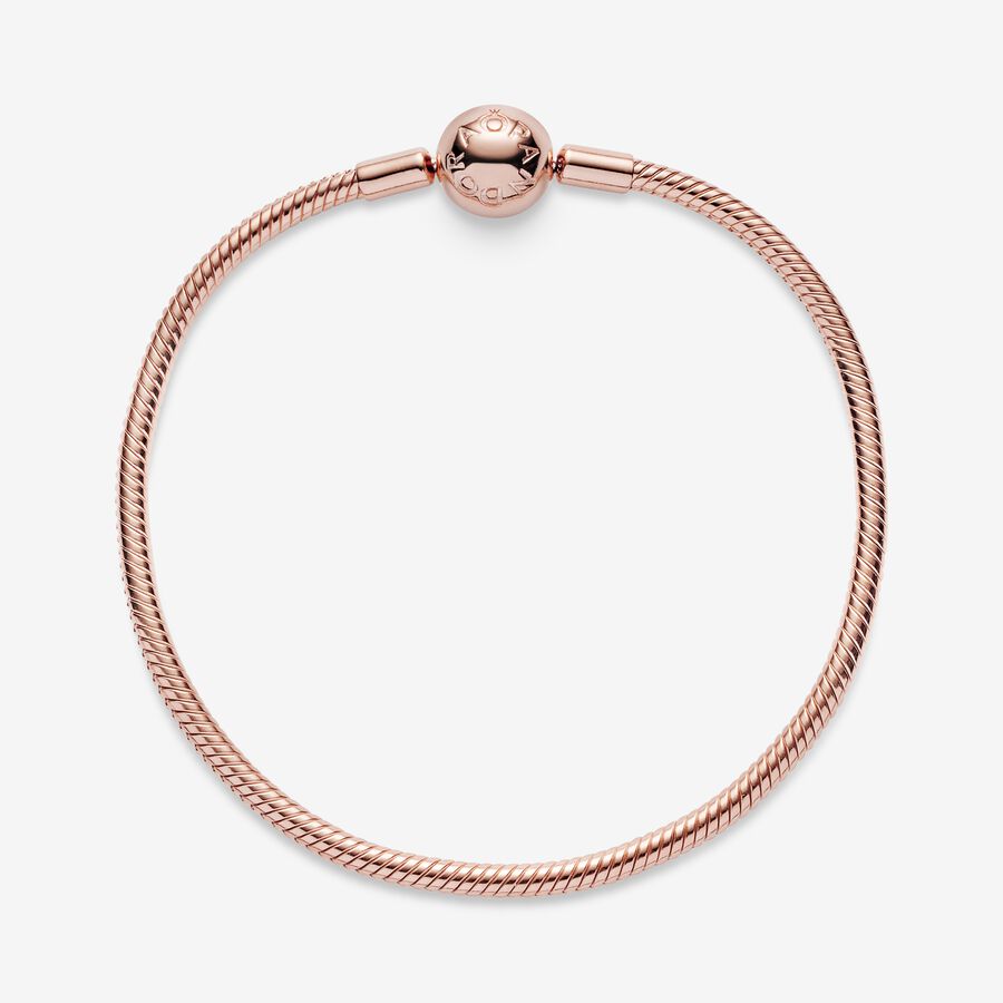 Start your very own Pandora story with this sleek, 14k rose gold-plated Moments Snake Chain Bracelet. The perfect canvas for your creativity, this hand-finished bracelet can be styled in countless ways. Fill it with your desired charms and clips, wear it on its own for a simple, understated look, or stack it with contrasting bracelets for a fun play on textures – the only limit is your imagination!