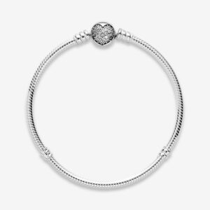 A carrier for the personal memories and milestones that make you, you, this Pandora Moments snake chain charm bracelet lets you wear the pieces that mean the most close to your heart, in layers or alone as the meaningful centerpiece of your jewelry look. The sterling silver design is fitted with a ball clasp that’s elegantly detailed with a heart of cubic zirconia to put the sparkle in your style. Just add charms.