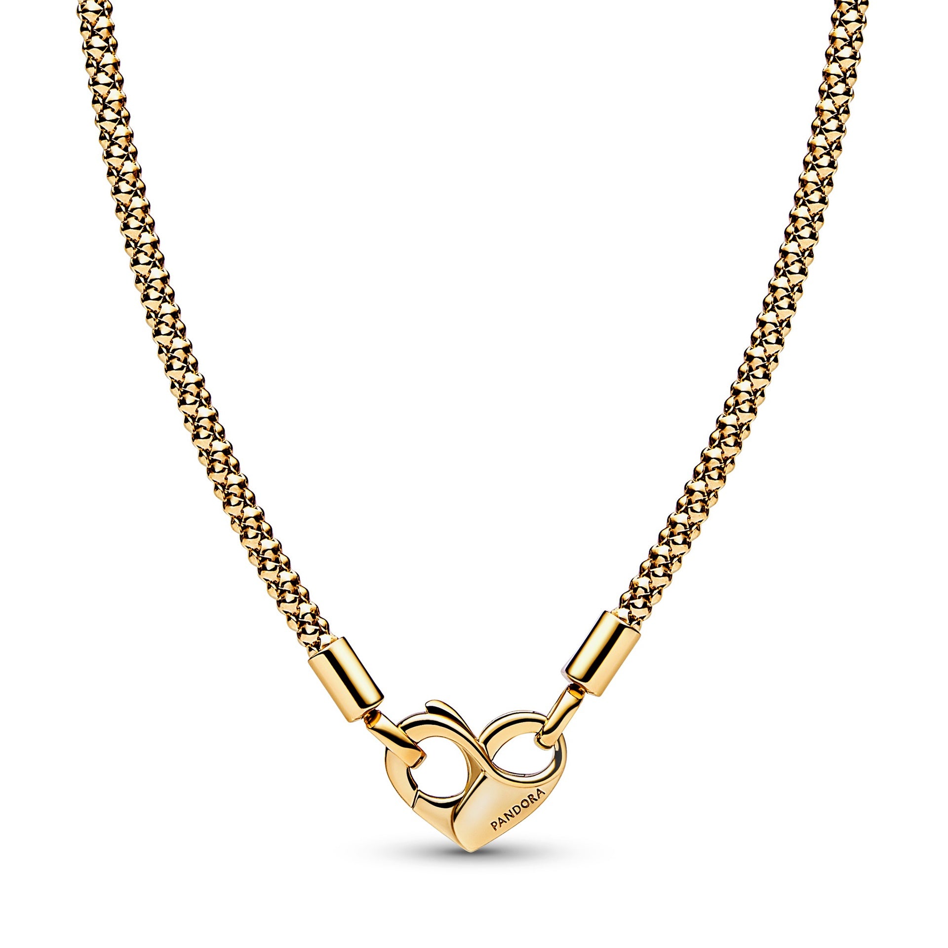Update your jewelry collection with the Pandora Moments Studded Chain Necklace in our 14k rose gold-plated unique metal blend. This hand-finished necklace features a flexible, textured chain and an infinity-detailed heart clasp with an interior infinity symbol. This studded chain necklace can be styled with any size of the Pandora Moments O Pendant or Heart Charm Pendant. Please note the clasp cannot be styled with charms.