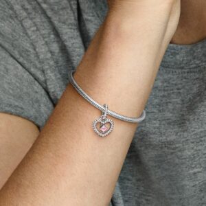 Like fluffy fairy floss or a flock of flamingos? All that you are and all you love, captured in color. Inspired by the beaded designs of Purely Pandora, this heart-shaped dangle is hand-finished in sterling silver and features a claw-set buff top-cut petal pink man-made crystal in the center. Wear it on Pandora bracelets or necklaces to define and redefine your style by choosing colors that express who you are.