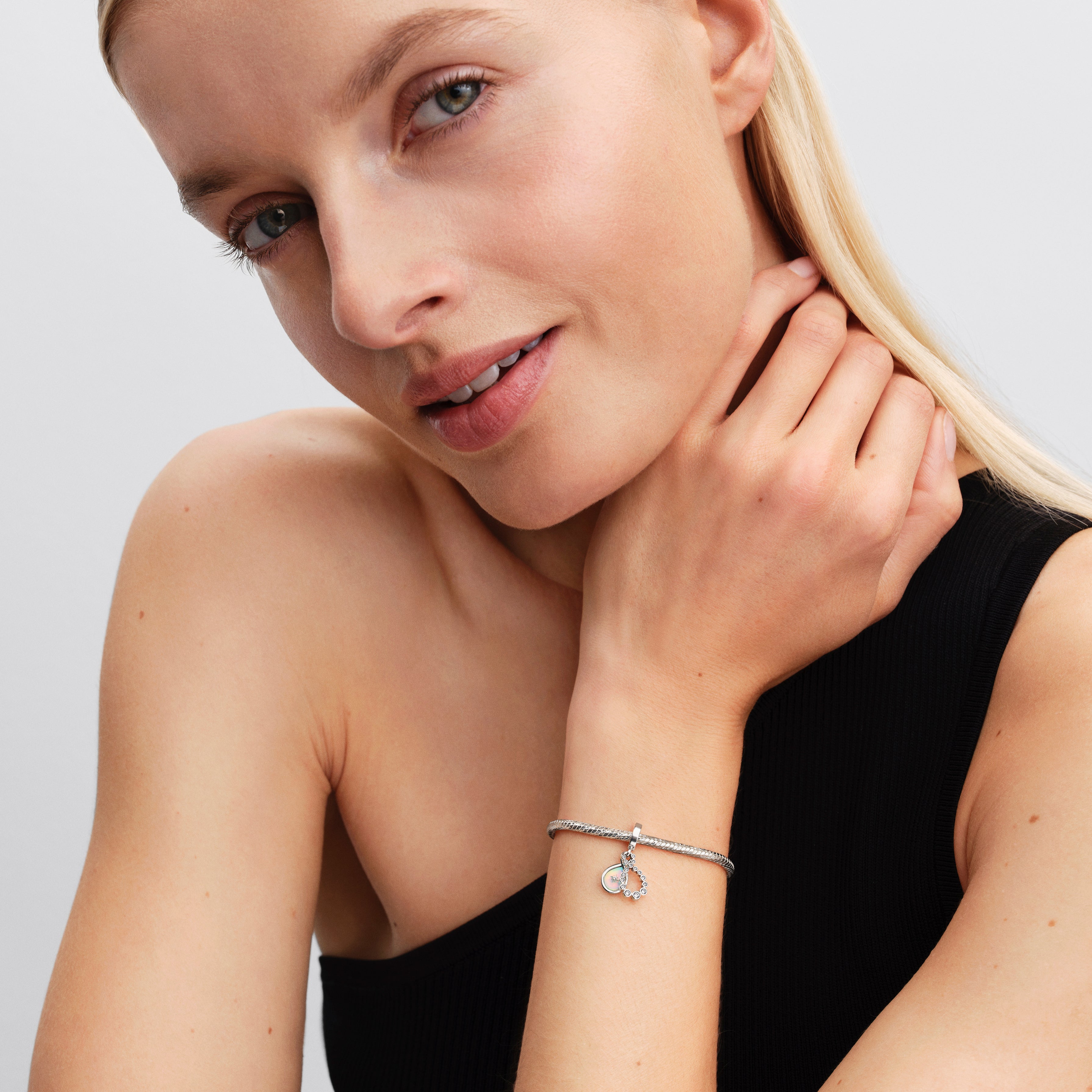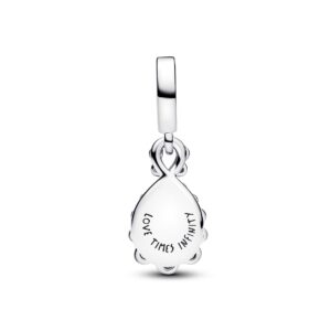 This sterling silver double dangle sparkles with clear cubic zirconia on one charm and aurora lab-grown opal resin on the other. Engraved with ‘LOVE TIMES INFINITY’, wear it as a reminder of everlasting connections.