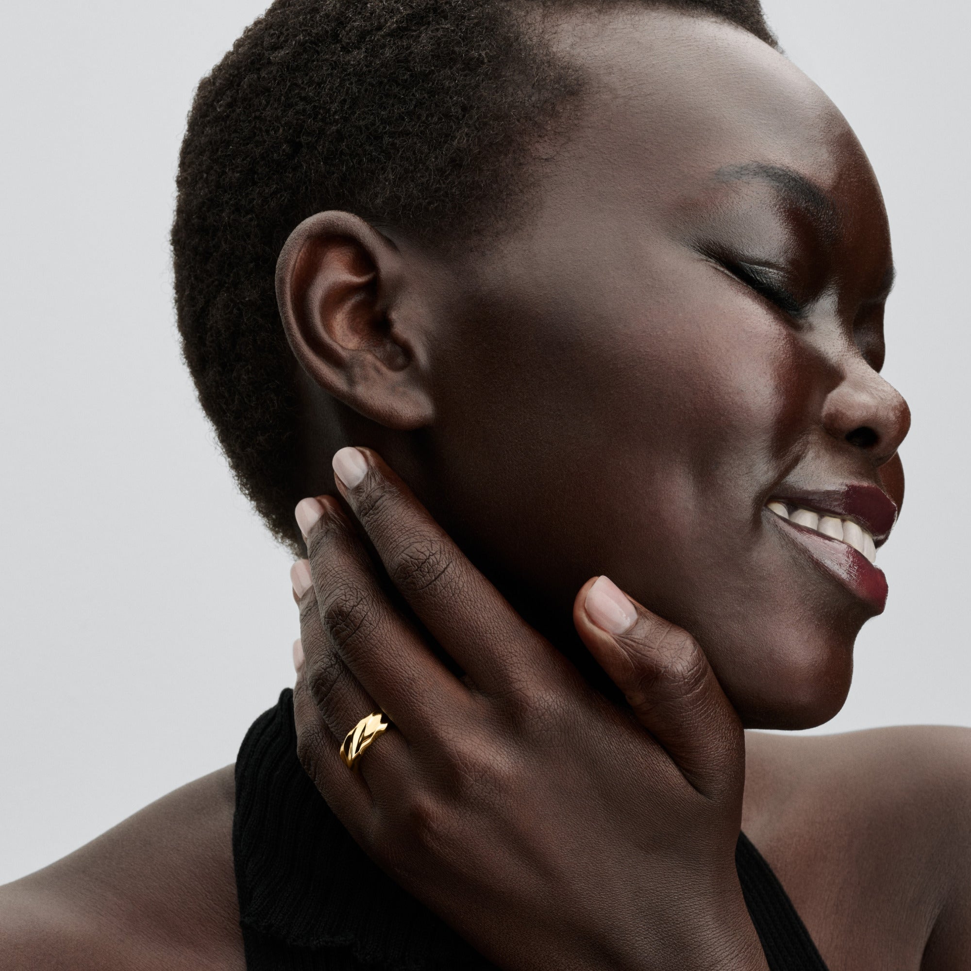 Experience the Rippled Wide Band Ring, a bold 14k gold-plated ring featuring a rippled design pattern. Crafted with love, this statement piece embodies the freedom to express your identity.