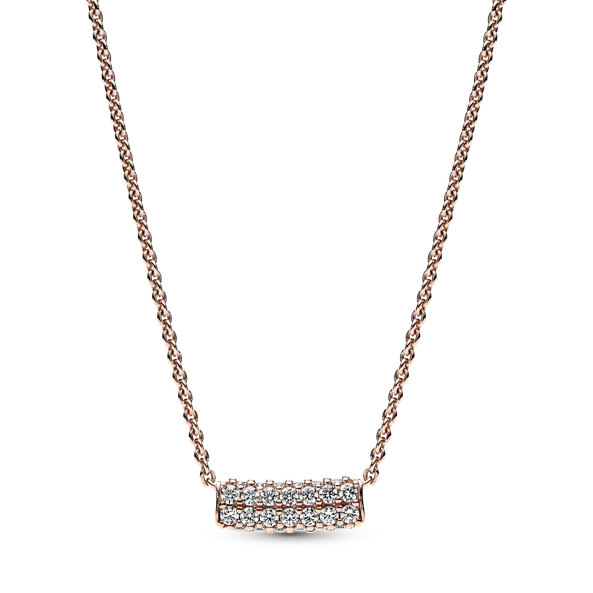 Maximize your full sparkle potential with the Pandora Timeless Pavé Double-row Bar Collier Necklace. This versatile piece features a curved bar pendant fixed to the chain with a geometric finish and a double row of sparkle, enhanced with extra rows of stones that face outwards on each side. Add a warm glow with our 14k rose gold-plated finish that offsets the three-dimensional sparkle. Adjustable to two lengths, wear this piece as a statement on its own or layer with more styles for a bold look.