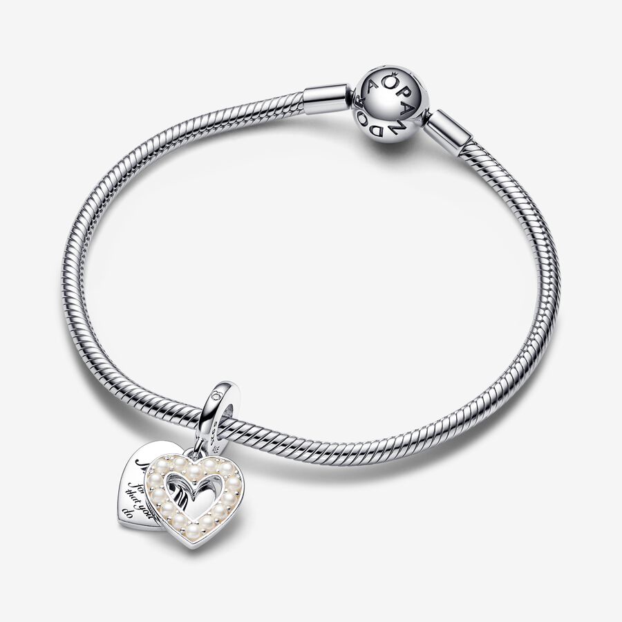 An elegant gift for a mom who loves pearly tones. The Pearlescent White Heart Double Dangle Charm is crafted from sterling silver and features a cut-out heart shape adorned with a row of bioresin man-made mother of pearl stones. Behind this is another heart-shaped disc with the engraving “Thanks M❤M for all that you do”, with a cut-out heart at the centre forming the central letter in the word “M❤M”. Celebrate the mother figure in your life with a jewelry gift that speaks to your gratitude for all her love and care.