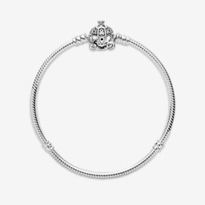 Make a wish with the Pumpkin Clasp Pandora Moments Bracelet. Hand-finished in sterling silver, celebrate the 70th anniversary of ’s with this bracelet. This piece features a pumpkin carriage with stone settings for windows, four hearts that form a clover and a 3D crown on the roof, a grooved heart for a door handle and pumpkin wheels. With the Pandora and logos on the back, attach your favorite x Pandora charms to this bracelet for a magical effect.