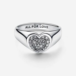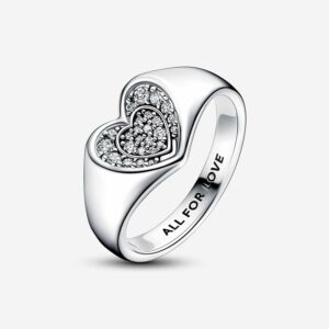 Channel the vibrant energy of love with our Radiant Heart Pavé Signet Ring. This ring features a concave, multidimensional heart design, accented with sparkling pavé and hand-finished in sterling silver. “ALL FOR LOVE” is engraved in the inside of the band as a sweet reminder of the power of two hearts joining together.StoneCubic ZirconiaColourClearThemesLoveProduct TypeRingsItem192491C01MetalSterling silverMaterialNo Other MaterialDimensionsDepth:2.8 mmHeight:9.5 mmWidth:11.1 mm