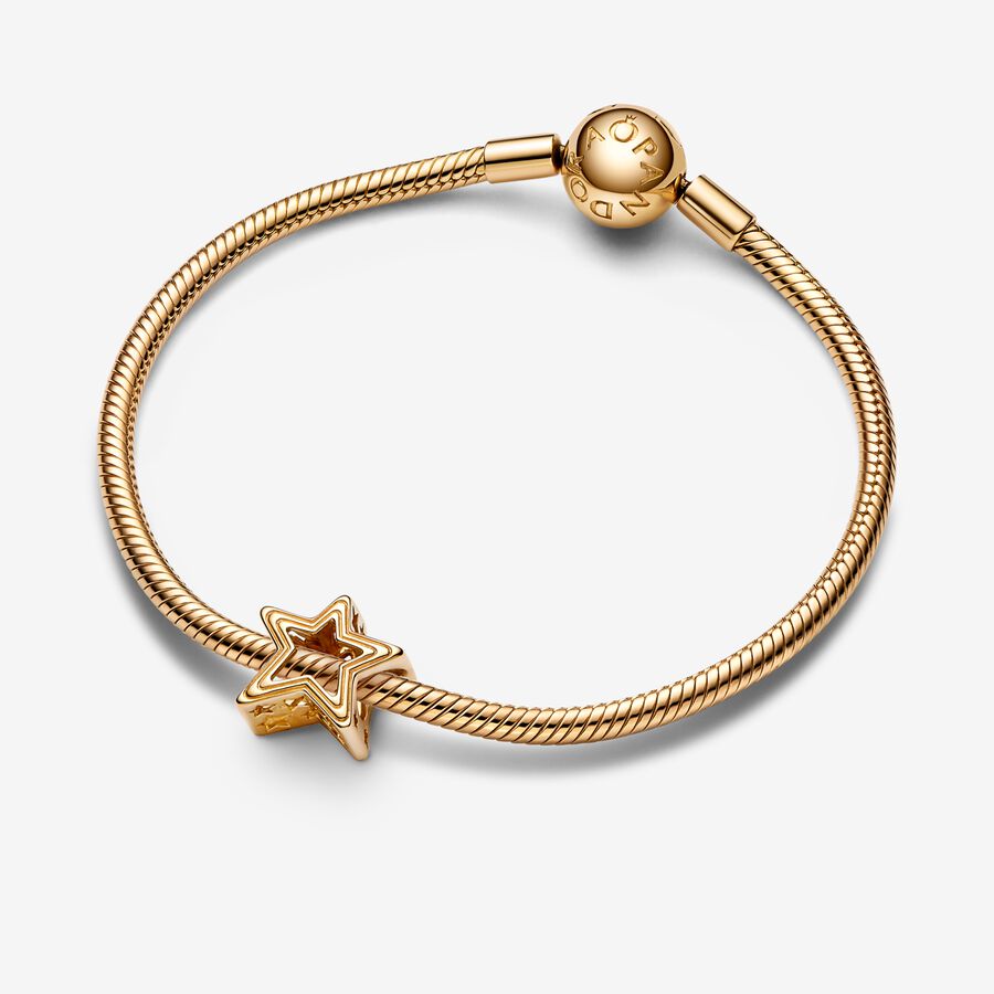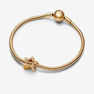 This Radiant Star Charm is an elevated symbol of hope, positive wishes and daring to dream. Crafted in 14k solid gold, it features a three-dimensional cut-out star shape with an asymmetrical design for a contemporary look. Grooved lines follow the shape of the star, and star cut-outs around the edges of the charm add a touch of magic and stardust.