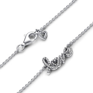 Spell out what’s in your heart with the Sparkling Handwritten Love Collier Necklace. This sterling silver necklace features a fixed pendant shaped like the word “love” in a handwritten style, adorned with sparkling cubic zirconia pavé. The letter “o” is shaped like a heart for a playful touch. The chain is adjustable to three lengths and has a tiny openwork heart dangle near the clasp. Gift it as a wearable love note to a special person – yourself or someone else.