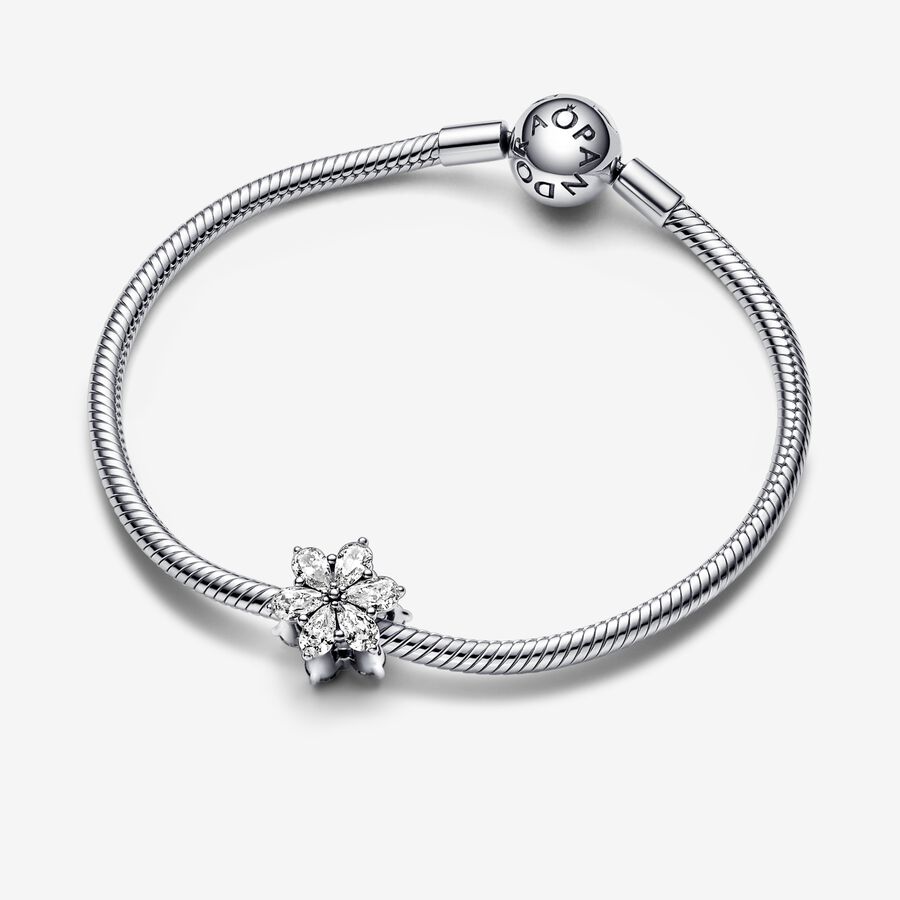 Take inspiration from the beautiful shapes of nature with the Sparkling Herbarium Cluster Charm. Inspired by pressed flowers and leaves, this hand-finished charm features a cluster of pear-shaped clear cubic zirconia stones on each side, creating an elegant, nature-inspired shape. A cluster of microbeads at the centre of the stones creates the finishing touch. Style it on your favorite bracelet or charm holder as an everlasting reminder of the beauty of nature.
