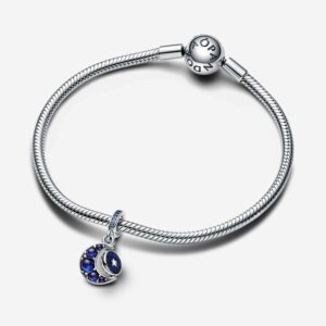 Sparkling blue stones and shimmering enamel come together in the Sparkling Moon Spinning Dangle Charm. This charm features a crescent moon shape set with smooth cabochon-cut man-made crystals in three different shades of blue, creating a dreamy effect. The small sterling silver disc inside the curve of the moon is designed to spin and features shimmering enamel on one side and a “Dreams come true” engraving on the other. Wear this sterling silver dangle charm to inspire you to pursue your dreams, every day.Compatible WithME/MomentsStoneMan-made crystalColourBlueThemesFamily and FriendsProduct TypeCharmsItem792979C01MetalSterling silverMaterialEnamelDimensionsDepth:2.8 mmHeight:10.8 mmWidth:11.3 mm