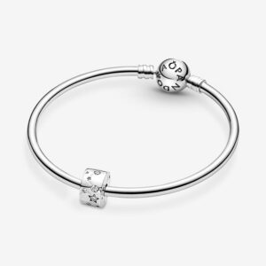 Add starry beauty to any look with the Stars & Galaxy Clip Charm. This celestial-inspired charm is hand-finished in sterling silver and detailed with rows of clear cubic zirconia and engraved cut-out stars. The stones and stars are connected by shimmering silver white hand-applied enamel stripes. The design features no silicone grip, so it can be worn over threads (two raised charm dividers). Add this charm to your look as a reminder to always reach for the stars.