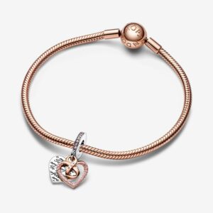 A jewelry gift for a mom who will always be perfect to you, just as she is. The Two-tone Infinity Heart Double Dangle Charm features an openwork heart dangle in 14k rose gold plating forming an infinity symbol in the center, adorned with a row of pink pavé and engraved with the word “Mom” with a pink stone as the central letter. Behind it is a sterling silver heart-shaped disc engraved with the message “To me you are perfect” creating a repeating pattern on both sides. Pink pavé on the bail adds a finishing touch. A celebration of motherly love in all its forms.