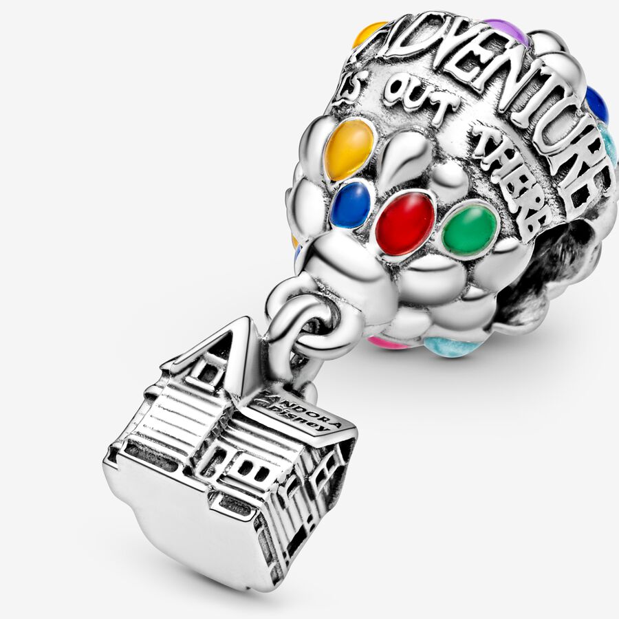Get ready to go on a journey of a lifetime with ’s Up House & Balloons Charm. The colorful charm features a bundle of hand-applied enamel princess blue, light blue, mandarin orange, pale cerise, vibrant green, purple and magenta balloons carrying the sterling silver dangle house that Carl uses to go on his fantastic journey. Raised letters amongst the many colorful balloons add an inspirational touch with the statement “Adventure is out there”.